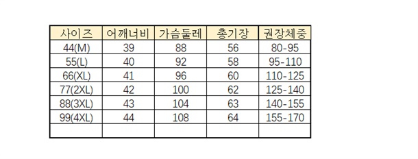 44(M),55(L),66(XL),77(2XL),88(3XL),99(4XL)