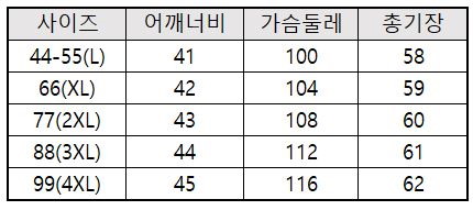 44-55(L),66(XL),77(2XL),88(3XL),99(4XL)